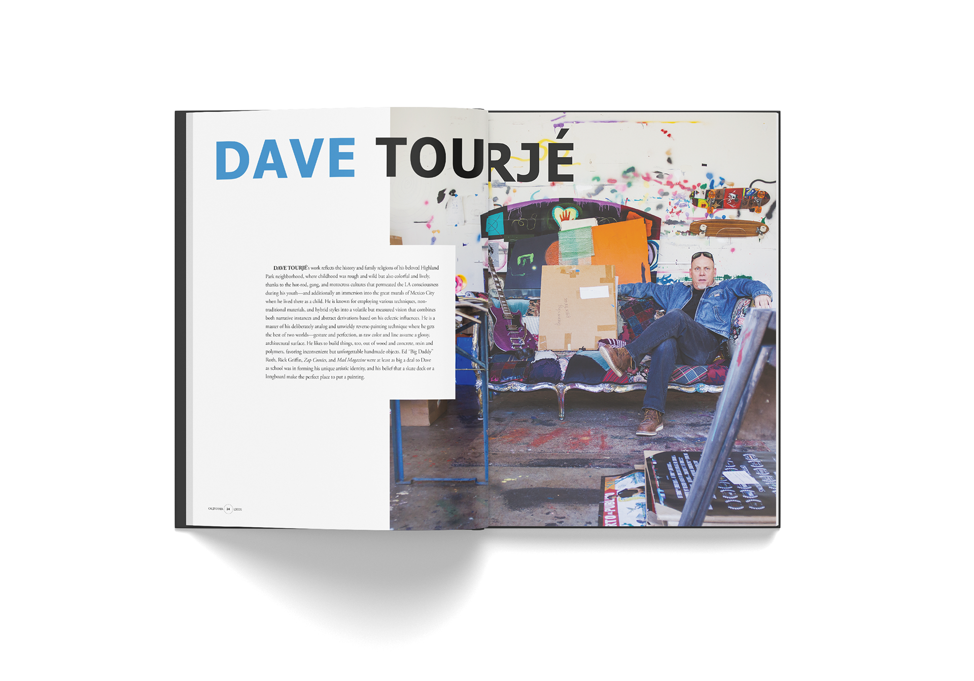 Dave Tourjé was born and raised in the culturally eclectic Northeast L.A. of the 1970s and his upbringing amongst the skaters, gangs, and the area’s tribal friction play heavily in his work. Also a musician, Tourjé was a member of the influential L.A. band the Dissidents, playing shows with Camper Van Beethoven, Saccharine Trust, The Minutemen to name a few. Tourjé’s artwork oscillates between high and low, punk and institutional hegemony and was the subject of a one-man exhibition covering 15 years of paintings on acrylic glass at the Riverside Art Museum in 2002. It has been featured at the Oceanside Museum of Art, the Orange County Museum of Art, and Laguna Art Museum. In 1998, Tourjé helped to form the Chouinard Foundation after purchasing the home of Nelbert Chouinard, in order to help restore the lost history of one of the great art schools in the world.